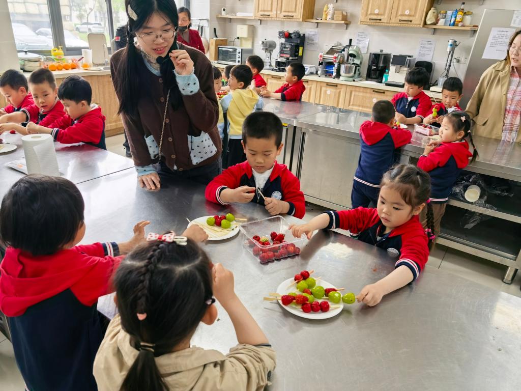 理论科普结束后,迎来最受期待的动手实践环节。在老师与助教的指导下,孩子们规范洗手、准备食材,认真完成串果、熬糖、蘸糖、冷却等步骤,亲手制作出晶莹剔透的冰糖葫芦。大家专注投入、互相协作,沉浸式体验传统美食的制作乐趣,在动手操作中巩固科学知识,感受食物从原料到成品的奇妙变化,脸上洋溢着收获与喜悦。