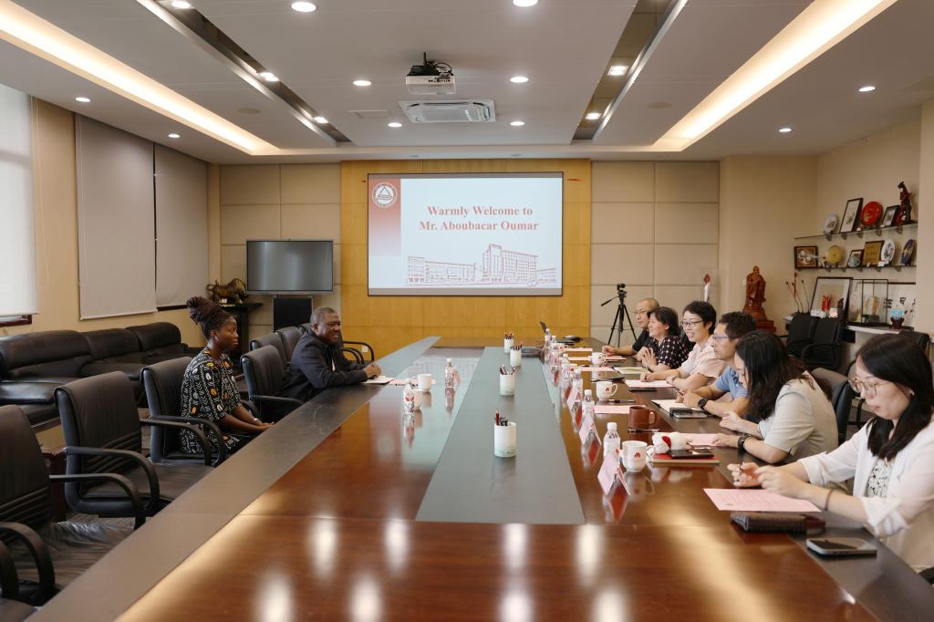 近日,江南大学食品学院留学生校友、几内亚科纳克里大学高级研究服务部主任Aboubacar Oumar Bangoura博士重返母校访问交流。食品学院党委书记傅莉莉,院长孙秀兰,副书记、副院长陈勇,副院长谢云飞,院长助理吕小妹,教授张连富等共同参与接待与座谈。