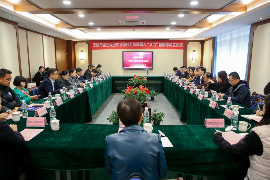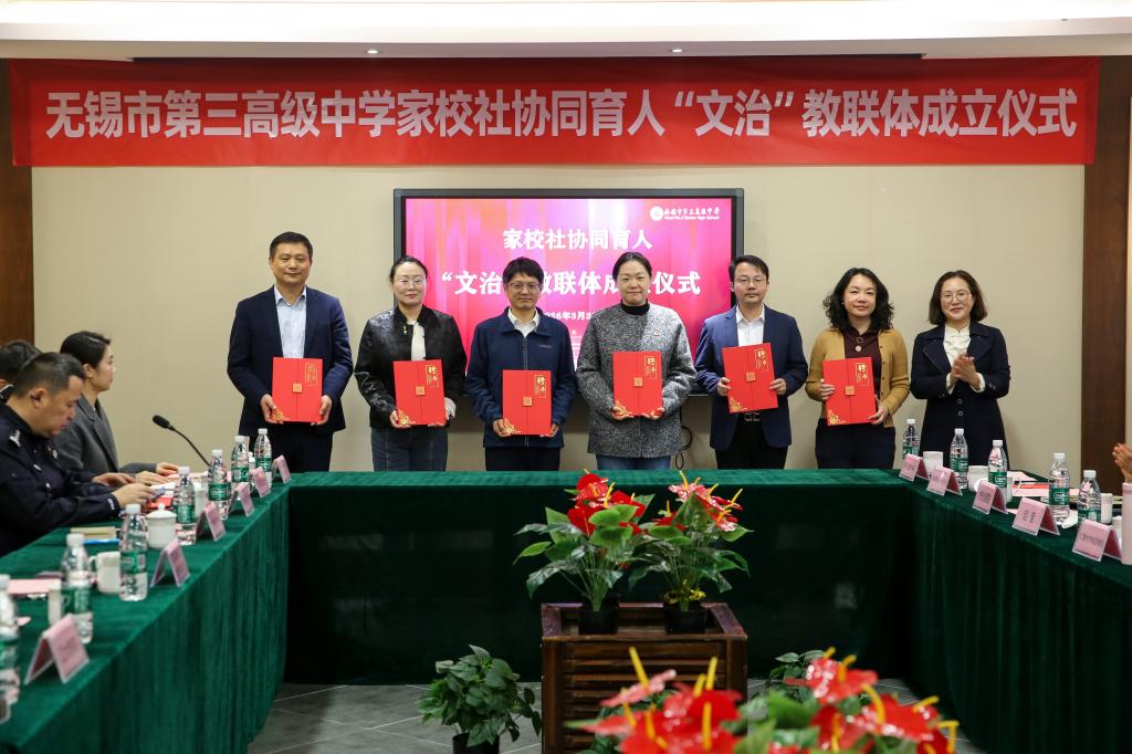 无锡市第三高级中学副校长赵莹宣读“文治”教联体成员单位名单,党委书记刘丽平为各成员单位颁发聘书。来自高校、街道、医院、企业、场馆等22家成员单位代表共同见证教联体正式启航。